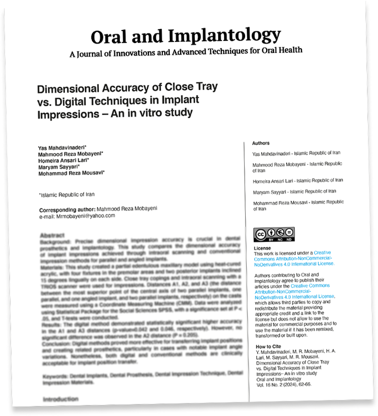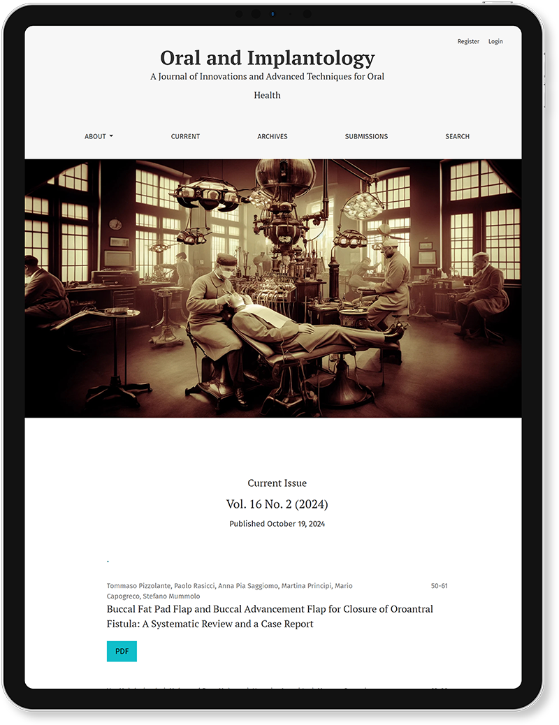 Oral and Implantology ensures visibility and credibility for your research. With our double-blind review system supported by the Open Journal System (OJS) platform, we offer rapid publication for studies ranging from pioneering techniques to clinical research.
